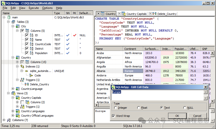 SQLiteSpy是一款快速、轻量级的免费SQLite管理工具,提供了图形化的数据操作界面。​SQLiteSpy基于Delphi语言开发,目前只支持Windows平台。功能特性•绿色免费:SQLiteSpy是一款免费软件,而且可以解压之后直接运行,不需要进行安装。•轻量快速:SQLiteSpy程序大小只有几个MB,启动...