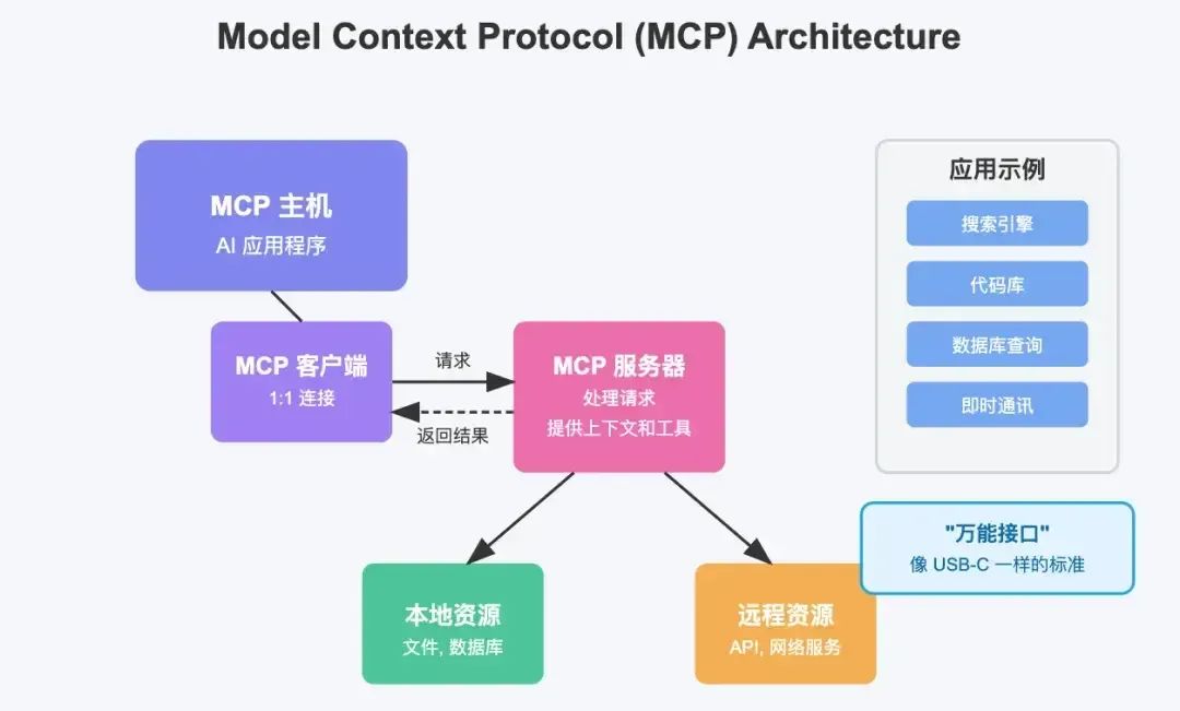 • MCP 的本质它是一个统一的协议标准,使 AI 模型能够以一致的方式连接各种数据源和工具,类似于 AI 世界的"USB-C"接口。