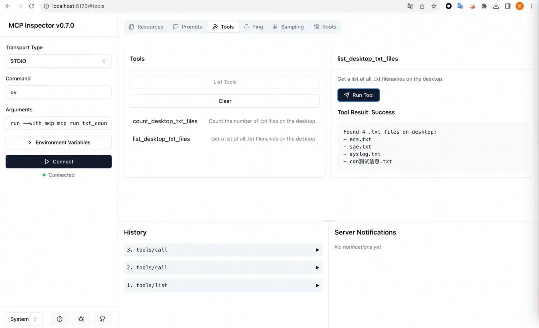 打造一个 MCP 服务器,它能够:- 功能:    - 统计当前桌面上的 txt 文件数量    - 获取对应文件的名字