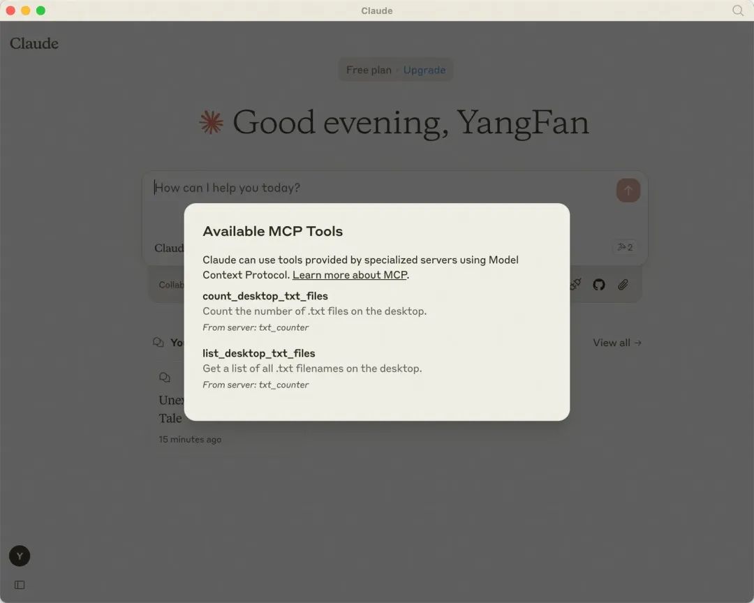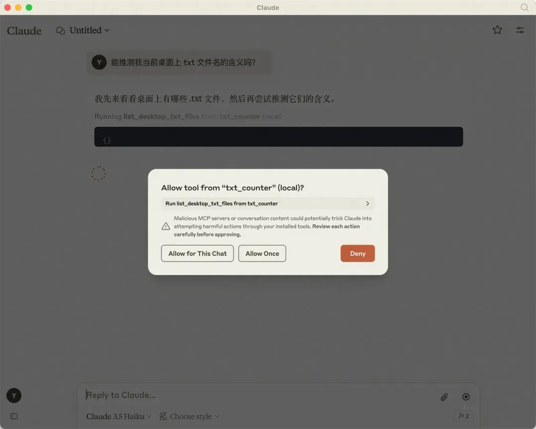 本节内容主要参考了官方文档:Quick Start: For Server Developers(https://modelcontextprotocol.io/quickstart/server)。这里准备了一个简单的示例,使用 Python 实现一个 MCP Server,用来统计当前桌面上的 txt 文件数量和获取对应文件的名字(你可以理解为一点用都没有,但是它足够简单,主要是为了难以配置环境的读者提供一个足够短的实践记录)。以下实践均运行在我的 MacOS 系统上。