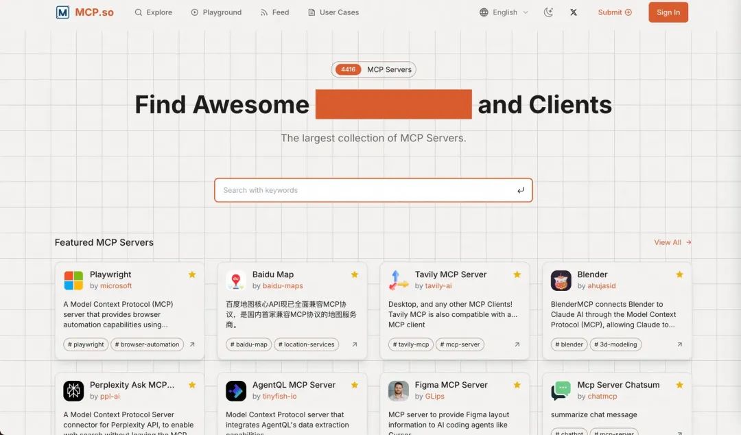 MCP 还处于发展初期,但其潜力巨大。更重要的是生态,基于统一标准下构筑的生态也会正向的促进整个领域的发展。我们可以看看MCP工具平台:https://mcp.so/