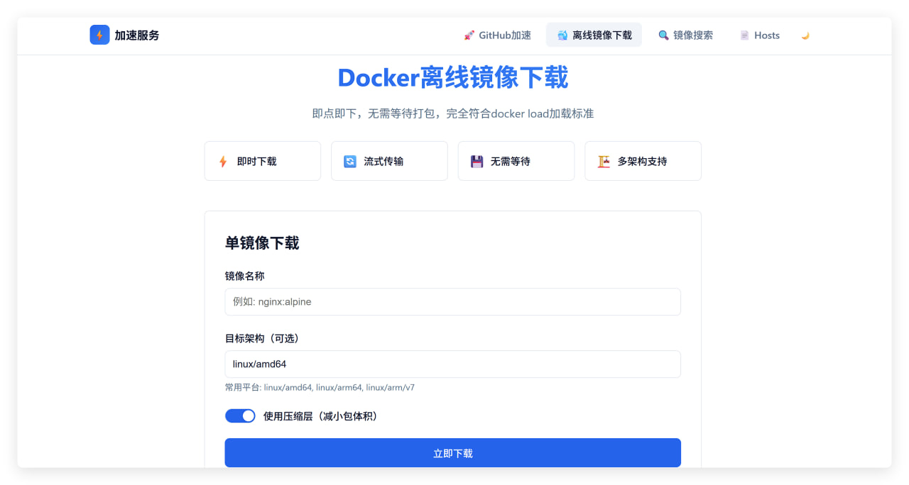 🐳 离线镜像包 - 支持下载离线镜像包,流式传输加防抖设计。