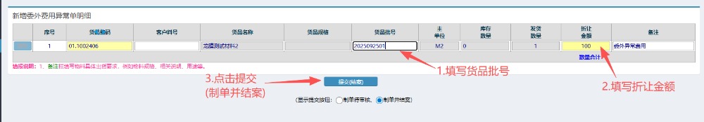 4.选好物料后,按图操作:填写货品批号以及折让金额,最后点击提交(制单并结案)。