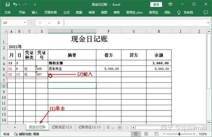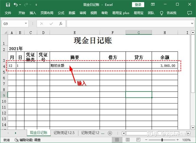 通过记账凭证是很容易完成现金日记账的登记工作的,具体做法为:找到涉及“库存现金”科目的记账凭证,将其中需要的数据抄录到账簿中,然后计算出余额即可。但对于Excel而言,如果有记账凭证表格,那么这些数据都能复制或直接引用,余额也可以通过设计公式来自动计算,这样就大大提高了工作效率。假设现金日记账的期初余额为3860元,该月发生了7 笔与现金收支相关的经济业务,下面就利于Excel来完成现金日记账的登记工作。