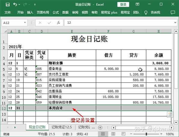 通过输入和复制记账凭证中的相关数据,可以很快完成现金日记账的登记工作。对于现金日记账余额的输入,则可手动设计公式来实现自动计算。