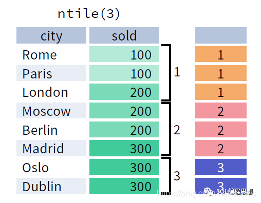 NTILE(), 将分区内的数据分为 N 等份,为每行数据计算其所在的位置。