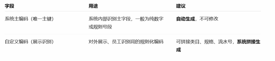 三、编码到底咋用在系统里?1、编码怎么生成? 千万别手动填!真的,千万别。 手动填的结果就是:重复的多、错的多、乱的多。 最好的办法是:系统自动生成,设置统一规则。 比如: 结构建议:类别+关键属性+流水号 举个例子:RM-SS304-5MM-00012 RM=原材料,SS304=材质,5MM=规格,00012=流水号 你只要在系统里设置好规则,系统就能帮你搞定,还不会重复。