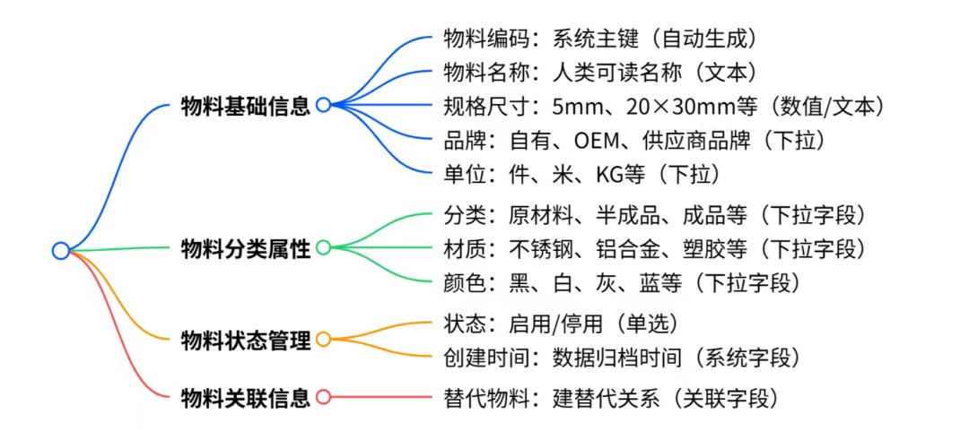 二、物料编码有啥讲究?1、唯一性 一个物料就只能有一个编码! 你不能今天建了“电机001”,明天又建个“电机002”,其实是同一个东西。这种“一个东西多个码”,一出问题谁都说不清楚。 2、稳定性 编码一旦建好,尽量别动它。你要是觉得“这个名字听起来不顺耳”,那你可以去改“物料名称”,编码别碰。 改编码就像给人换身份证号,要改的话财务、库存、订单、对账全得跟着改,一不小心全乱套。 3、简洁性 别把编码当物料简介写! 有的公司喜欢把所有信息都塞进去:颜色、品牌、尺寸、材料……结果一个编码特别长,系统也跑得慢,员工也记不住。 正确做法是: 编码只负责识别身份,其他信息放属性字段里。 4、易维护 好的编码,是谁都能看懂、能用,不靠记忆,也不靠“老员工经验”。 最靠谱的方法是: 系统自动生成 + 统一规则 + 明确权限。谁能建档、谁能改、谁能审核,一清二楚。 5、可扩展 今天你只做电源,明天可能要搞电机、电控、五金件……那编码体系要经得起“膨胀”。 别加个新品类就重建一套编码,那之前的又得全改一遍。主编码需要保持稳定,扩展信息靠属性字段单独维护才是正解。