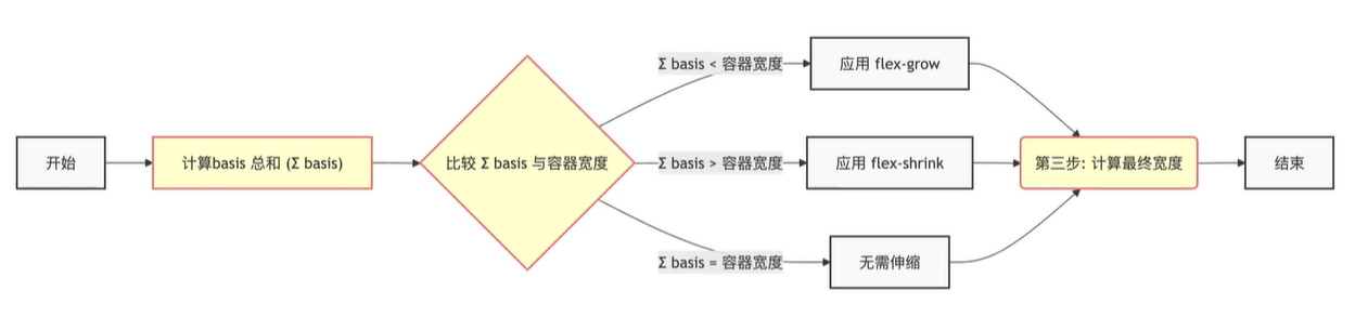 前情早期css布局使用最多的就是浮动,后面出了Flex后,就基本抛弃了浮动的使用,基本每个项目起手就是FLex,特别是小程序端,官方就是主推的Flex布局,所以Flex布局在我平时开发中有的非常多,也是非常好用的布局方式,相比以前你得费一些周折的布局方式,现在都能轻轻松松实现,用的多但是有一些计算细节其实也是理解不是特别深的,flex布局中有一个flex复合属性,用于控制弹性盒子子元素尺寸的,分开就是flex-basis+flex-grow+flex-shrink,最近在B站看到一个介绍Flex的视频其中说详细讲到 了计算逻辑的内容,感觉干货挺多,特此记录 各属性功能描述flex-basis定义了在分配多余空间之前,项目占据的主轴空间(main size)。浏览器根据这个属性,计算主轴是否有多余空间。它的默认值为auto,即项目的本来大小,它可以设为跟width或height属性一样的值(比如200px),则项目将占据固定空间 flex-grow定义项目的放大比例,默认为0,即如果存在剩余空间,也不放大;如果所有项目的flex-grow属性都为1,则它们将等分剩余空间(如果有的话)。如果一个项目的flex-grow属性为2,其他项目都为1,则前者占据的剩余空间将比其他项多一倍 flex-shrink定义了项目的缩小比例,默认为1,即如果空间不足,该项目将缩小;如果所有项目的flex-shrink属性都为1,当空间不足时,都将等比例缩小。如果一个项目的flex-shrink属性为0,其他项目都为1,则空间不足时,前者不缩小,负值对该属性无效 Flex空间分配逻辑Flex空间分配的三步法: 第一步计算所有子元素basis的总和 第二步比较容器宽度和总的basis宽度的 第三步计算容器宽度 总的basis小于容器宽度,应用flex-grow 总的basis大于容器宽度,应用flex-shrink 总的basis等于容器宽度,无需伸缩 整个流程图如下: