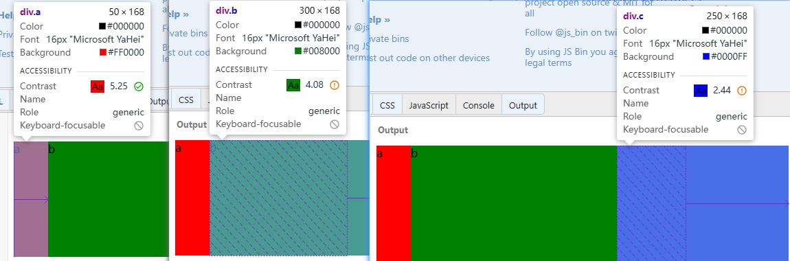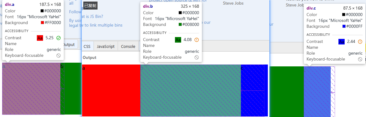计算实战当空间充足时,flex-grow生效,元素尺寸变大一起加大多余的空间当前项的最终宽度 = basis + (容器宽度-总的basis) * 当前项的grow/总的grow,下面来看一个示例 关键代码如下: 演示地址:https://jsbin.com/fibecijohi/edit?html,css,output 计算解析: Flex容器container下有三个子项分别为a,b,c 容器的宽度为600 总的basis = 0(a)+200(b)+100(s) = 300 总的grow = 1(a)+2(b)+3(c) = 6 a项的宽度= 0 + (600 - 300) * 1/6 = 50 b项的宽度= 200 + (600 - 300) * 2/6 = 300 c项的宽度= 100 + (600 - 300) *3/6 = 250