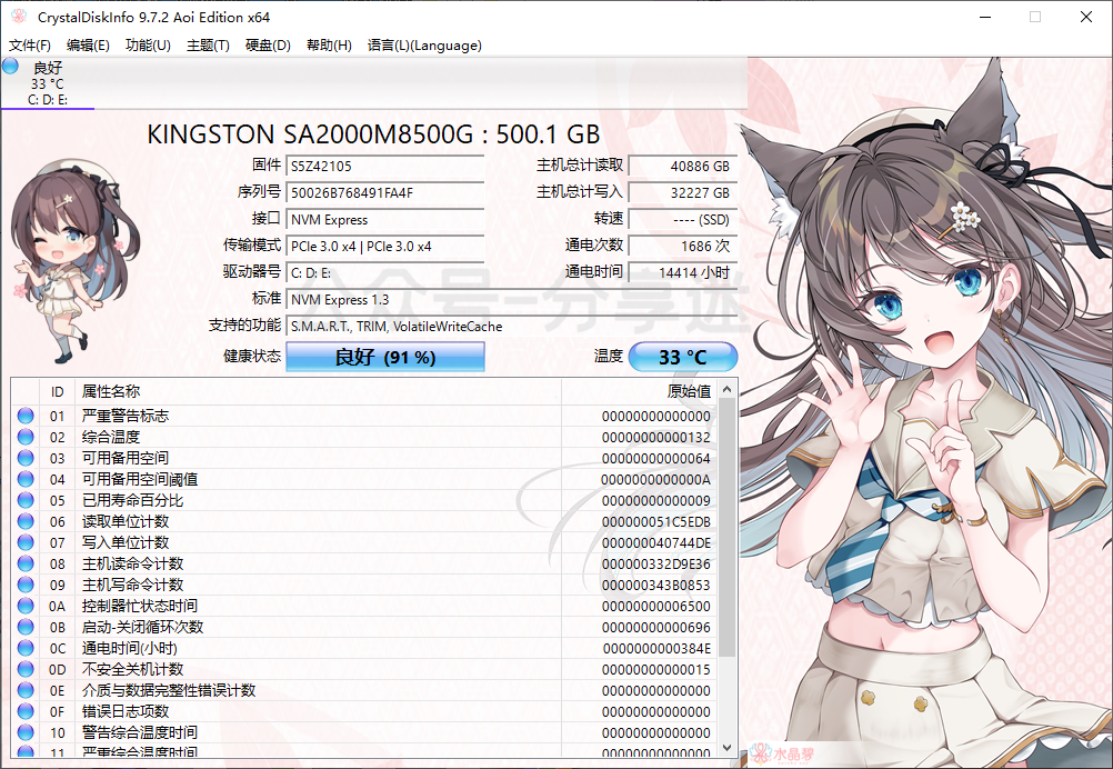 这是一位日本开发者开发的专业硬盘健康状态信息检测工具,专为检查 HDD 机械硬盘和 SSD 固态硬盘的状态而设计。