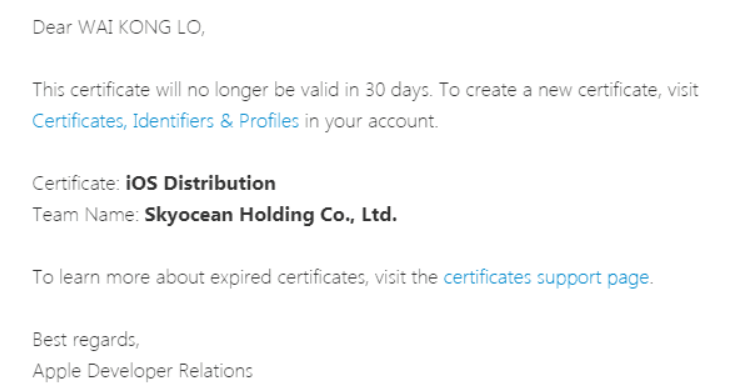 虽然distribution过期(或者被手动revoke)了,如果你的开发者账号是company(公司)类型或个人类型的,只要你的每年99$的开发者membership没有过期,就不会对已上架的app产生影响,只是你下次发布或者更新app就要重新生成一个distribution证书了。如果你的开发者账号是enterprise类型(企业级)的,证书过期或被revoke了之后,那么安装过该证书打包的app的用户将无法打开该app了,这就需要开发人员重新生成证书再打包一个app了。 该文章在 2025/10/14 11:25:07 编辑过 |