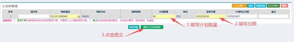 5.选好物料后,填写计划数量日期,最后点击提交