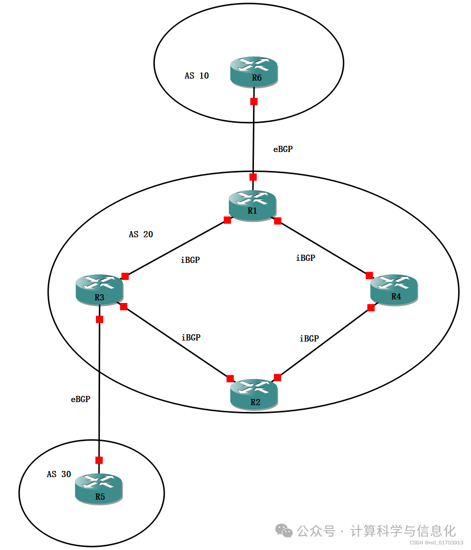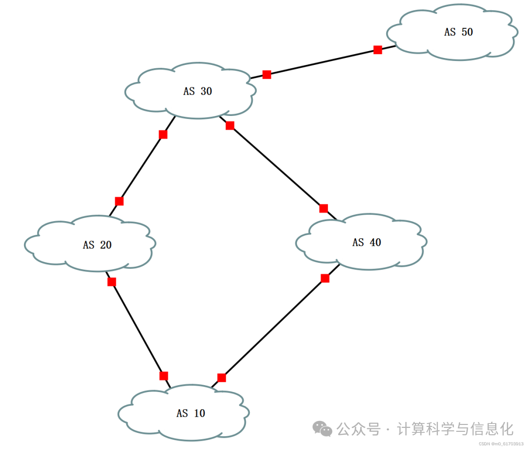 BGP 更新源 BGP并不能主动在网络中寻找邻居,必须手工指定BGP邻居的地址,那么BGP才会将数据包发往指定的地址来请求建立邻居。 与此同时,BGP发出的请求数据包除了写明目标IP地址外,还要写上自己的IP地址,即BGP源地址。 路由器自己产生流量后从接口发出时,流量从哪个接口被发出,那么这些数据包的源IP地址就是哪个接口的地址。 因此当BGP发出数据包寻找邻居时,这些数据包从那些接口被发出,那么BGP源IP地址就是哪个接口的地址。 要两台BGP路由器要正常建立邻居,必须双方路由器都相互指定邻居,相互发送数据包才行。 当一台BGP路由器收到建立邻居的请求后,如果发现数据包的目标IP不是自己的BGP源地址。 那么就拒绝该连接的请求后,只有当请求数据包的目标与自己的BGP源地址相同时,才可建立BGP邻居。 需要注意的是,这个条件只在两个邻居之间,任意一个邻居满足条件即可,并不需要双方都满足; 也就是说一方收到的数据包目标IP与自己的BGP源地址相同即可; 另一方收到的数据包目标IP与它的BGP源地址不同也没关系,只要单方面符合条件就行,但我们通常都将BGP两端的源与目标保持一致。 BGP 的源地址是可以随意更改的,但只能是路由器上的接口地址。如下图: ![]() 在上图中,R1与R2之间有两条链路。 当配置BGP邻居时,如果R1指定邻居地址为12. 1.1.2, R2指定邻居地址为12. 1.1.1。 那么在建立邻居过程中,R1 将请求数据包从接口F0/0发出,数据包的目标IP为12. 1. 1.2, BGP 源地址为F0/0的接口地址12. 1.1.1。 当R2将请求数据包从接口F0/0发出时,数据包的目标IP为12.1. 1.1, BGP 源地址为F0/0的接口地址12. 1.1.2。 由于R1发出的数据包目标IP12. 1.1.2与R2的BGP源地址12. 1. 1.2完全相同,所以最终能够正常建立BGP邻居。 R1在检测地址时,R2的目标IP与R1的源也完全相同,通常我们都保证双方一致。 当R1与R2之间的直连接口F0/0中断后,如果双方将数据包从S0/0发出,那么R1的源地址就是10. 1. 1.1, R2的源地址就是20. 1.1.2; 由此可以看出,双方发出的数据包的目标IP都与对方的源地址不符,所以无法建立BGP邻居。 虽然在上面的网络环境中,双方路由器之间都拥有多条链路,在中断某条链路之间,仍然可以通信,但是这并不能保证BGP邻居的永久连接。 为了使拥有多条链路的BGP邻居之间永远保持连接,考虑到路由器的loopback口在设备正常工作的情况下,不会像物理接口那样出现中断,所以建议在BGP邻居之间使用loopback 接口的地址来建立TCP连接。 当指定邻居时,不再将邻居的地址指定为对方物理接口地址,而改为指定对方的loopback地址。 这样一来,既然物理接口中断,只要还有通畅的链路,那么BGP邻居仍然可以保持连接。 在将BGP邻居地址指定为对方loopback地址时,为了使数据包的目标IP与对方的BGP源地址相同,所以邻居也要将BGP源地址更改为自己的loopback接口地址,从而使得双方正常建立BGP连接。 在上图中,当R1指定邻居地址为2.2.2.2,BGP 源地址为1.1.1.1, 而R2指定邻居地址为1.1.1.1, BGP源地址为2.2.2.2,这样一来,双方的目标IP都与对方的BGP源地址相同。 所以可以正常建立邻居,并且在双方链路中,任何一条链路断开,都不影响邻居的会话,BGP 的连接仍然保持而不会中断,实现了连接的冗余性和稳定性。 BGP TTL BGP的路由可能会从一个AS发往另外一个AS,从而穿越多个AS。 但是由于运行BGP的网络会是一个很大的网络,路由从一个AS被发出,可能在经过转发之后,又回到了开始的AS之中,形成路由环路。 所以出于防止环路的目的考虑,BGP 在将路由发往其它AS时,也就是发给eBGP邻居时,需要在路由中写上自己的AS号码。 下一个 AS收到路由后,再发给其它AS时,除了保留之前的AS号码之外,也要添加上自己的AS号码。 这样写在路由中的AS被称为AS -path,如果BGP收到的路由的AS_ PATH中包含自己的AS号码,就认为路由被发了回来,以此断定出现了路由环路,就会丢弃收到的路由。 BGP只有在将路由发给eBGP时,才会在AS- path中添加自己的AS号码,而在发给iBGP时,是不会添加AS号码的。 因为iBGP邻居在同一个AS中,即使要添加,AS 号码全是一样的,所以没有必要。 ![]() 在上图中,当路由穿越各个AS时,所有发给eBGP邻居的路由,都会在AS-path中添加自己的AS,自己的AS总是添加在AS-path的前面。 例如: 一条路由从AS10被发往AS 20,则AS-path为“10”,当AS 20 将路由发往AS 30时,添加上自己的AS号码20之后,AS- path变成“20, 10”,当AS 30将路由发往AS 50时,AS 50收到的路由的AS-path为“30, 20, 10”。 当AS 30将路由发给AS 40, AS 40再将路由发给AS 10时,路由的AS- path为“40, 30,20, 10”; 由于AS 10 在收到路由后,发现AS- path中包含自己的AS号码10,所以认为出现环路,便丢弃收到的所有路由。 在IGP协议中,我们将路由协议分成两大类:距离矢量路由协议和链路状态路由协议,而BGP被划分为路径矢量路由协议(path-vector routing) ,路径矢量算法结合了距离矢量特性与AS- path防环特性。 因为BGP在将路由发给eBGP邻居时,会将自己的AS号码添加到AS- path中,所以可以以此来防止环路。 而在将路由发给iBGP时,是不会往AS -path添加AS号码的,因此在iBGP之间传递路由时,没有防止环路的机制。 考虑到为iBGP之间的路由传递也加入防环机制,因而强制将BGP路由在AS内部只传一跳。 具体操作为: 一台BGP路由器从eBGP邻居收到路由,发给iBGP邻居之后,iBGP邻居收到后就不能再传给其它任何iBGP邻居,只能传递给eBGP邻居。 此规则被多数人称为BGP的