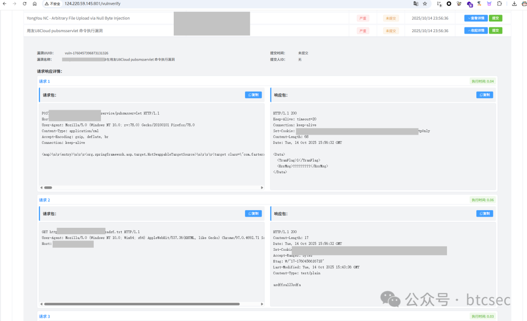 影响组件 用友 U8Cloud 是用友网络科技股份有限公司推出的新一代云ERP解决方案,主要聚焦成长型、创新型企业,提供企业级云ERP整体解决方案。 漏洞描述 影响版本 大部分版本 复现 星巡平台  阅读原文:https://mp.weixin.qq.com/s/zTjwhc9uSzf0JvlzJLS73Q 该文章在 2025/10/30 10:24:03 编辑过  |